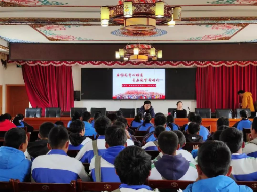 5月22日,甘肃省民族团结宣讲团走进迭部,在迭部县藏族中学开展“民族团结进步宣传月”进校园宣讲活动,甘肃社会主义学院讲师牛利利进行民族团结教育宣讲。迭部县委统战部相关负责人、迭部县藏族中学师生代表共计600余人聆听了宣讲会。