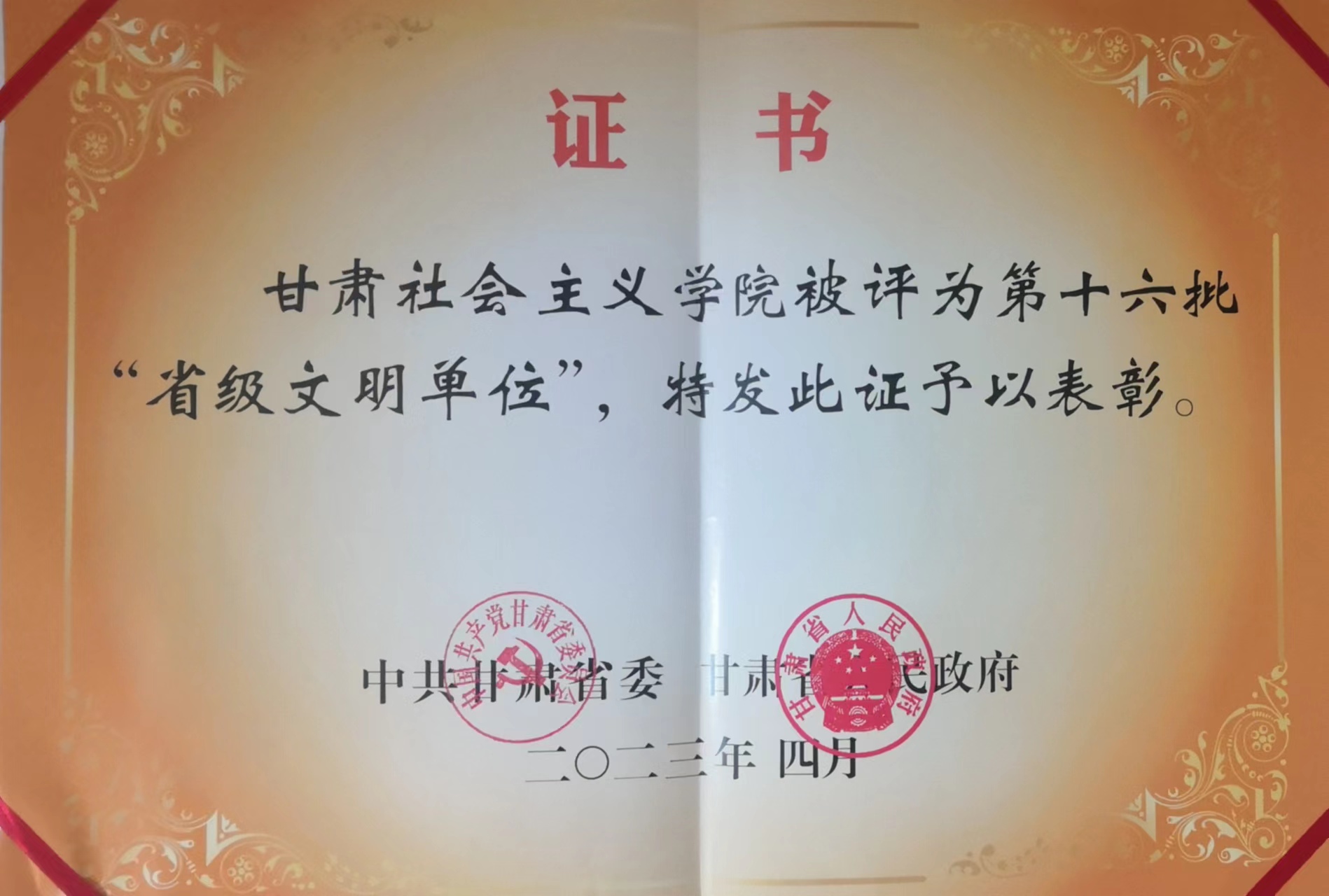近年来,甘肃社会主义学院坚持以习近平新时代中国特色社会主义思想为指导,深入学习贯彻习近平总书记关于加强社会主义精神文明建设的重要论述,紧紧围绕“举旗帜、聚民心、育新人、兴文化、展形象”的使命任务,全院联动、全员参与,以创建省级文明单位为目标,结合学院工作实际,抓优质服务,树优良作风,创优美环境,取得了显著成效。4月4日,省委、省政府将学院命名表彰为第十六批“省级文明单位”,颁发了奖牌和荣誉证书。