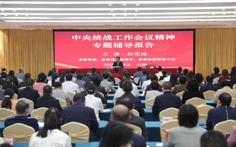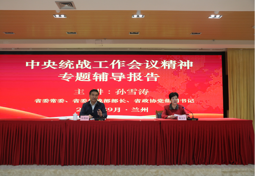 孙 雪涛部长从“深刻理解习近平总书记关于做好新时代党的统一战线工作重要思想的核心要义”“准确把握新时代爱国统一战线历史方位、内容”“深入领会促进中华儿女大团结的工作要求”“在贯彻落实中央统战工作会议精神中担当作为”等四个方面作了精彩辅导。报告紧 密结合甘肃统战工作实际,内涵丰富、论述精辟、思想深刻,具有较强的理论性、指导性和针对性,对于完整准确全面领会习近平总书记关于做好新时代党的统一战线工作的重要思想,把握新时代爱国统一战线的历史方位和重要使命具有重要指导作用。