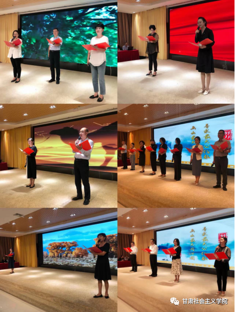 《诗意中国》、《中国话》、《放飞中国梦》、《从一把泥土中读中国》、《我的南方和北方》、《读中国》……统战理论教研部主任陈钰业教研部即兴诵读毛泽东诗词《清平乐·六盘山》。一首首扣人心弦的朗诵,引得阵阵掌声,弘扬了时代主旋律,歌颂了祖国的伟大复兴,更表达了对党的忠诚与热爱。