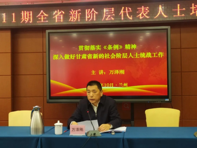 近期,第11期全省新的社会阶层代表人士培训班在甘肃社会主义学院举办,省委统战部副部长、甘肃社会主义学院党组书记、常务副院长焦玉兰参加开班式并介绍学院概况、提出培训期间管理要求,省委统战部副部长、省政府侨办主任、省侨联党组书记万泽刚参加开班式并讲话,50名新阶层代表人士参加。