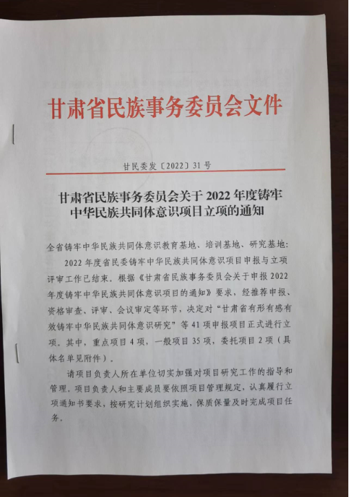 4月29日,省民委印发《关于2022年度铸牢中华民族共同体意识项目立项的通知》,对41项申报项目予以立项,并向项目课题负责人发送了《项目立项通知书》。其中,我院党组成员、副院长蒲晓贞负责、申报的课题《新时代社会主义学院开展铸牢中华民族共同体意识教育培训的功能优势及实践路径研究》,民族宗教教研部副教授闫脑吾负责、申报的《甘肃民族地区民族事务治理能力和治理体系现代化建设研究》2项课题获得立项。