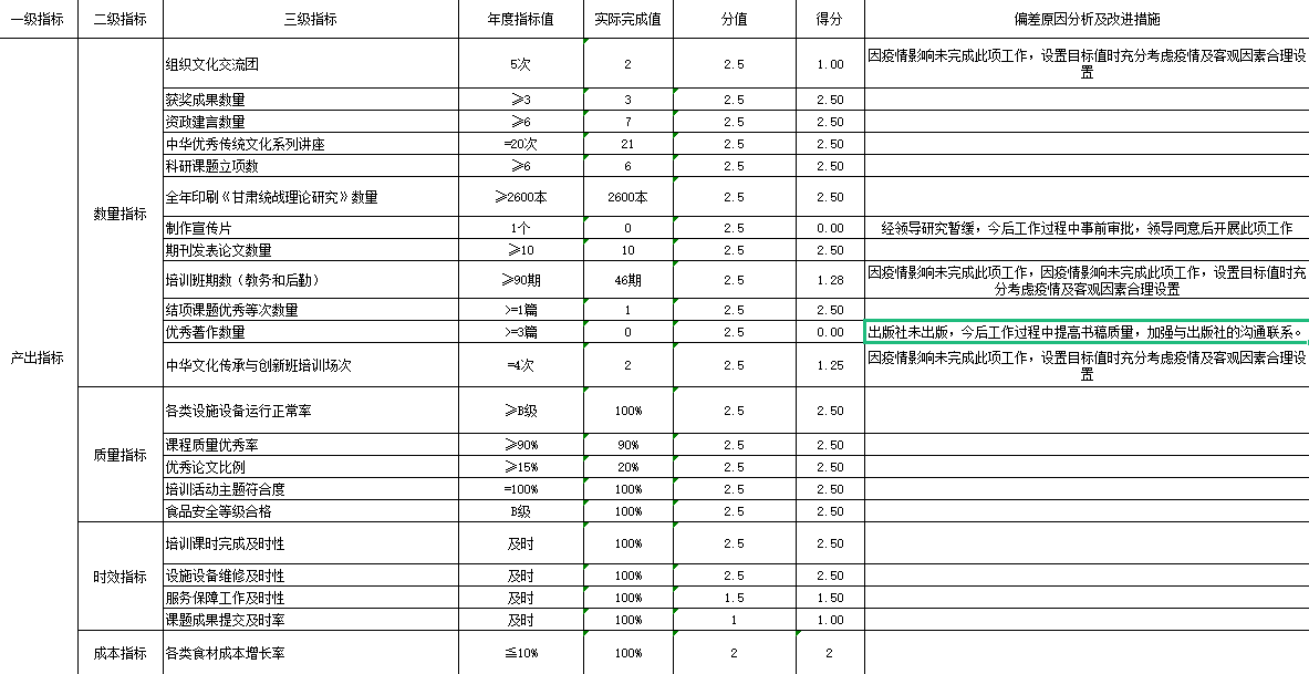 1、教学质量进一步提高,参训单位及学员满意度提高。2、完成2021年学院科研工作规划目标任务,科研成果数量和质量比上年度稳步提升。3、完成文化交流、中华优秀传统文化系列讲座等任务,推动甘肃中华文化教学培训工作更加丰富多样地开展。4、完成科研理论研究创新工程各项工作任务。5、加强后勤内控管理和精细核算,规范后勤员工管理机制,消除安全隐患,确保圆满完成各类培训班服务保障任务,设施设备维护维修任务,物业服务管理任务,进一步提高运营效益。6、不断完善“机要保密系统”,确保机要工作按要求运行;不断完善学院档案管理,做好档案整理、数字化和挂接工作。