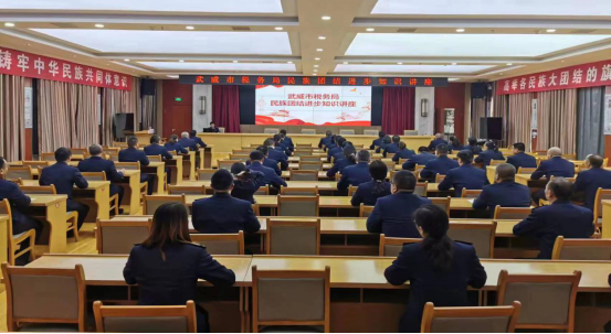▲武威市税务局把民族团结进步创建工作融入税收工作中,组织开展民族团结进步知识讲座,宣传党的民族政策法规,实现税收事业发展与民族团结进步的同频共振。