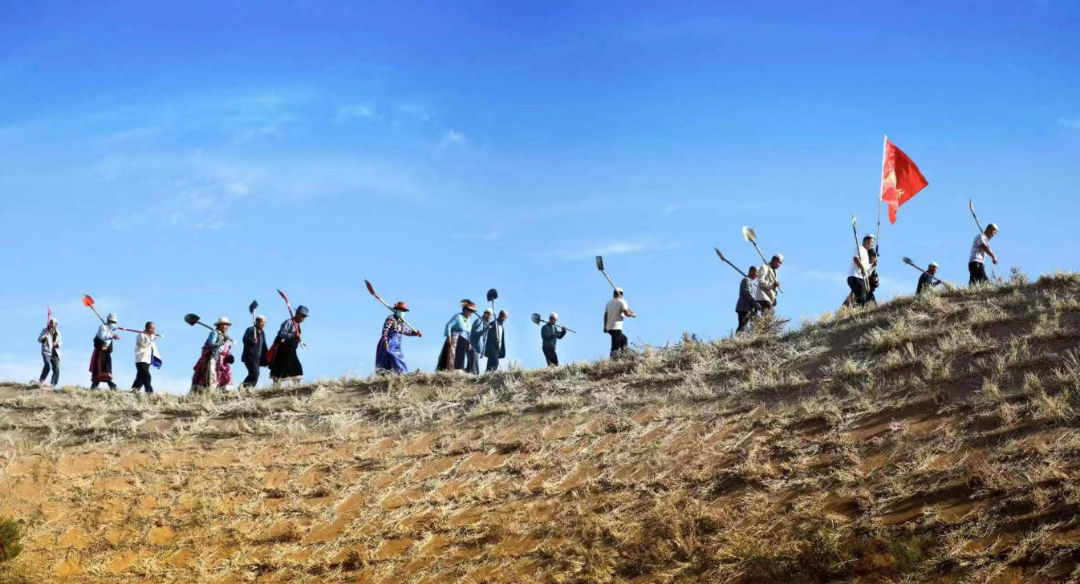 ▲为大力弘扬困难面前不低头、敢把沙漠变绿洲的新时代武威精神,古浪县组织开展“民族团结一家亲·同心共植生态林”义务压沙活动,为构筑西部生态安全屏障做出积极贡献。