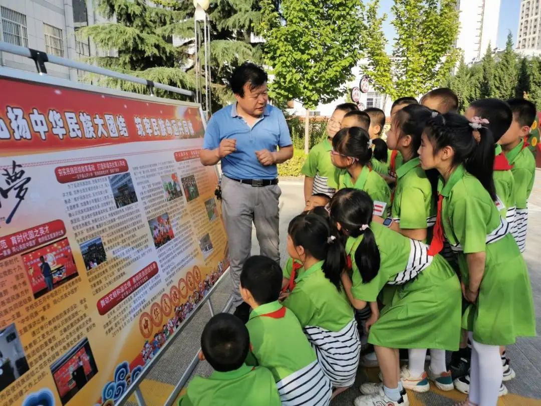 ▲正宁县山河小学校长任有运为学生讲民族团结知识