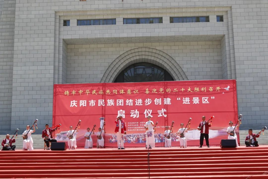 ▲南梁说唱《民族团结代代传》在庆阳市民族团结进步创建进景区启动仪式上表演