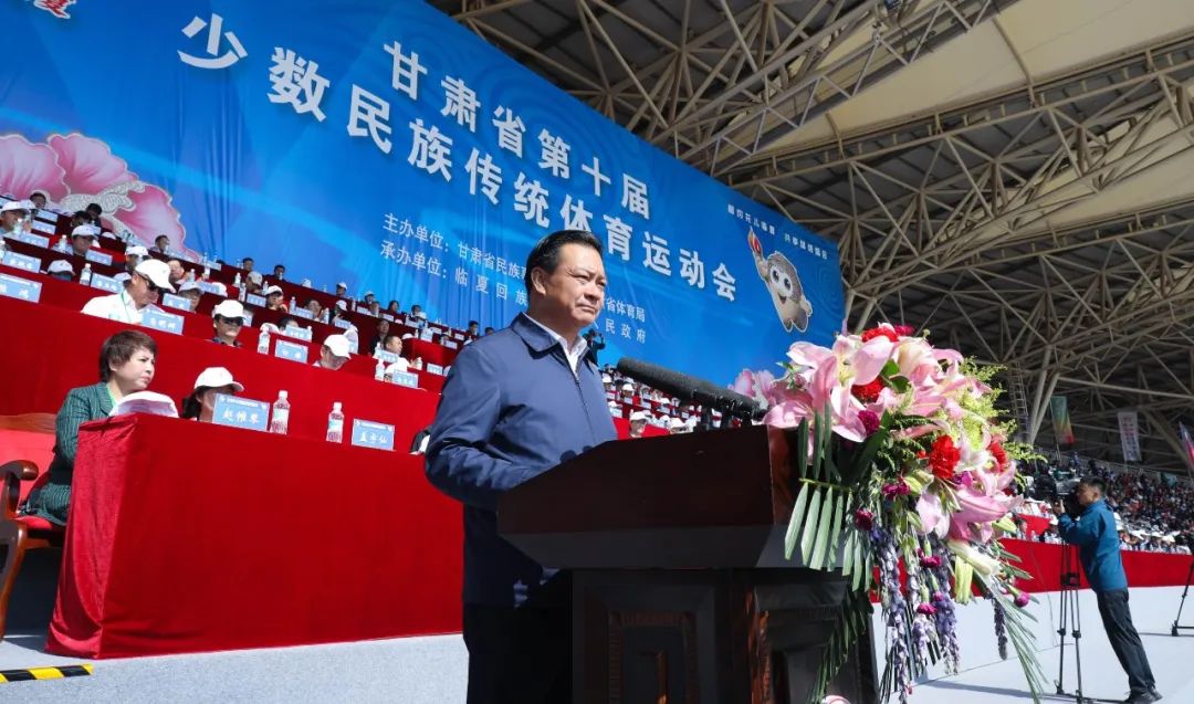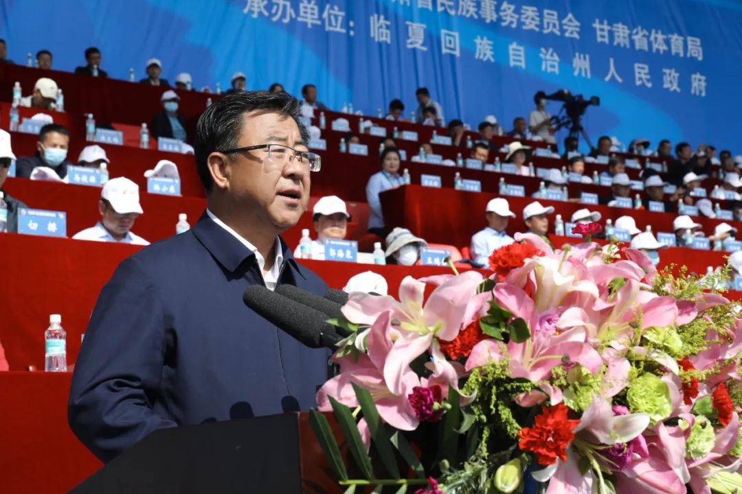 郭鹤立说,临夏历史悠久、文化灿烂,物华天宝、人杰地灵,是镶嵌在甘肃这柄“玉如意”上的一颗璀璨明珠。近年来,在以习近平同志为核心的党中央亲切关怀下,在党的民族政策光辉照耀下,全州上下夺取了脱贫攻坚战的全面胜利,与全国全省同步全面建成了小康社会,开启了大建设大发展的崭新局面。同时,坚持体育为人民服务的根本宗旨,以项目为抓手提升硬件水平,以青少年为重点抓体教融合,以群众体育为基础抓普及推广,以文化为根本抓体育精神传承,书写了临夏体育高质量发展的精彩华章。我们将坚决履行“当好东道主、办好运动会”的责任,精心精细提供最优的服务保障,专心专业创造最佳的赛事环境,为与会嘉宾和全省人民呈现一场精彩纷呈的运动盛宴。