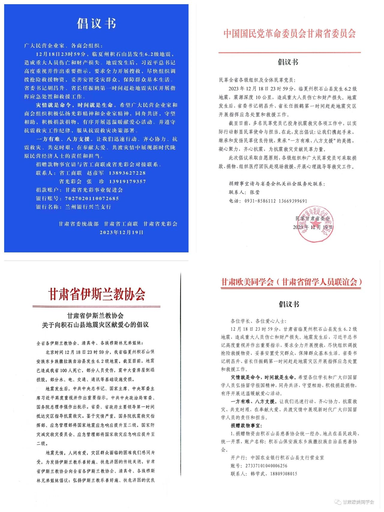 临夏州积石山县地震灾害发生后,省委统战部坚决贯彻落实习近平总书记重要指示精神,迅速响应省委号召,动员广大统一战线成员积极捐款捐物,为抗震救灾贡献统战力量。