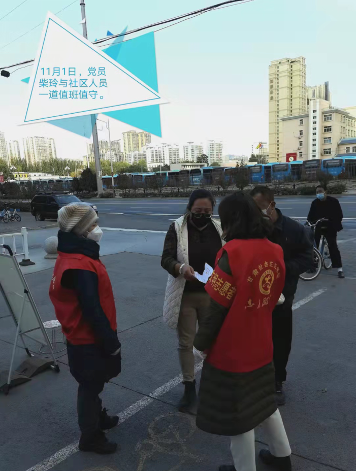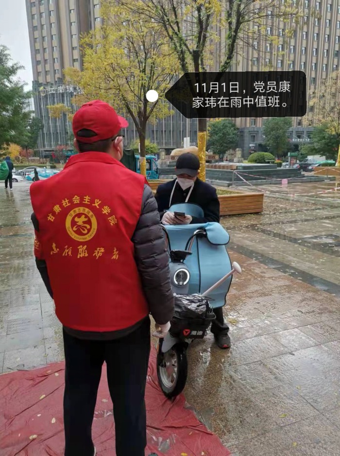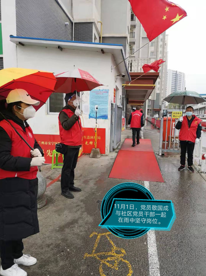 深秋的甘肃大地阵阵寒意袭来,正当大家宅在家里,享受清闲的愉悦、温暖的家庭、弹性上班自由的时候,广大志愿者们毫无怨言,坚守在抗疫一线。11月1日,尽管天在下雨、天气寒冷,志愿者仍然坚守岗位,细致做小区人员排查登记、外来人员劝返、重点人员协助管控、居家留观人员服务保障等工作,在当楼宇院落的“守门员”。