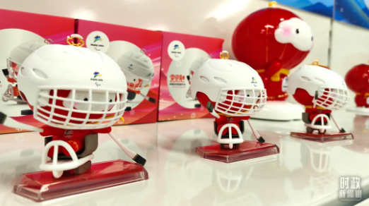 △冬奥村特许商品零售店内,冬残奥会吉祥物“雪容融”冰球运动文创产品亮相。(总台央视记者钟锋拍摄)