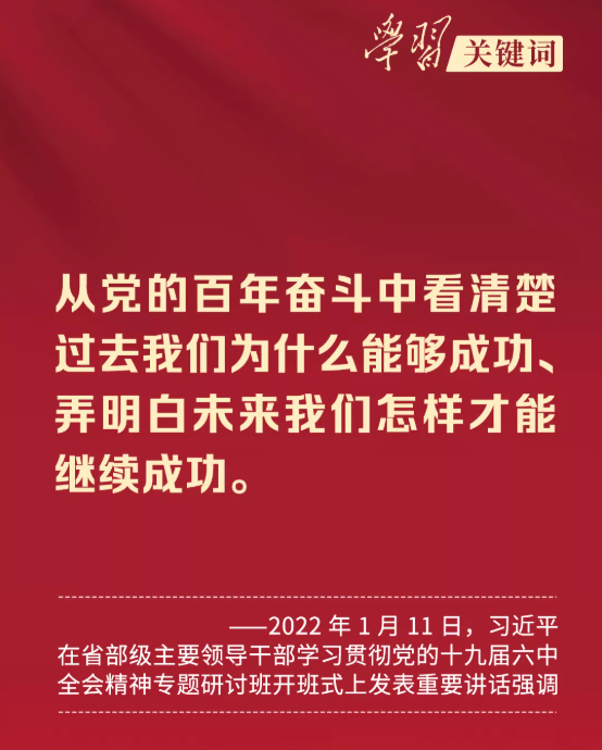 “从党的百年奋斗中看清楚过去我们为什么能够成功、弄明白未来我们怎样才能继续成功,从而更加坚定、更加自觉地践行初心使命,在新时代更好坚持和发展中国特色社会主义。”