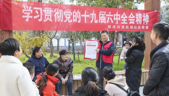 ▲江苏淮安,志愿者向居民宣讲党的十九届六中全会精神。