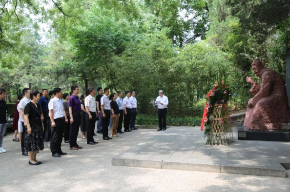 民盟中央在清华大学开展主题教育现场活动。图为向闻一多先生雕像敬献花篮。