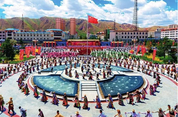 ▲天祝藏族自治县举行“欢乐藏乡·和谐天祝”万人锅庄舞表演