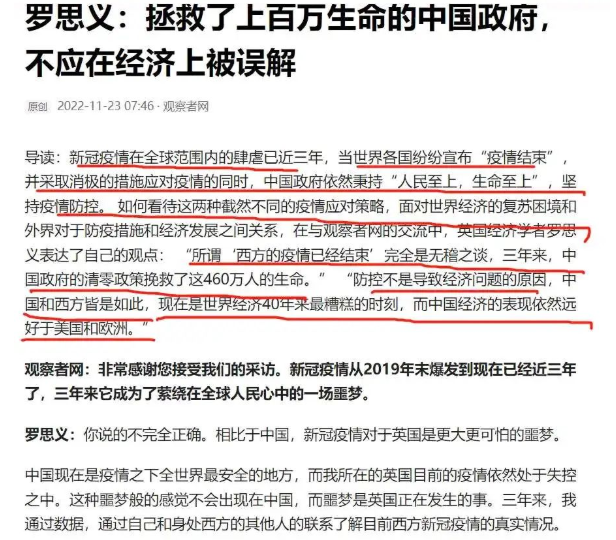 “所谓‘西方的疫情已经结束’完全是无稽之谈,三年来,中国政府的清零政策挽救了这460万人的生命。” “防控不是导致经济问题的原因,中国和西方皆是如此,现在是世界经济40年来最糟糕的时刻,而中国经济的表现依然远好于美国和欧洲。”